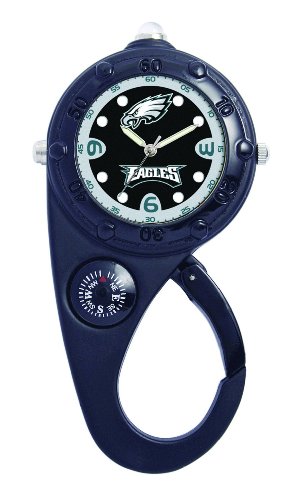 This Philadelphia Eagles clip watch from Ewatchfactory® is the perfect timepiece to be worn just about anywhere! With its black alloy metal case, spring-loaded clip, one-push red LED light, and compass, you will be ready for anything. The Japanese analog quartz movement keeps accurate time, and the luminous hands and Arabic hour marks make it easy to read.