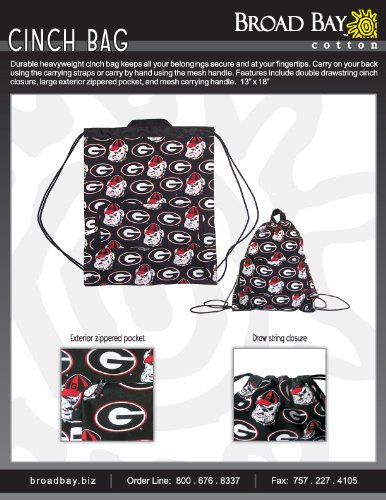 Our durable cinch backpack bag keeps everything secure and at your fingertips. Features a double drawstring cinch closure, a sturdy carrying handle, and an interior slip pocket with a hook-and-loop strap closure. A large exterior zippered pocket holds your wallet and keys secure. Carry on your back using the drawstring straps, or carry by hand with the secure handle. 15" x 18" when flat.