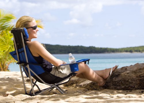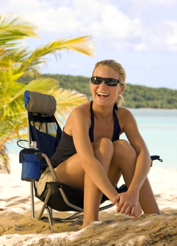 This casual chair folds so it can be packed on your back to a beach, pool, park, concert or other outdoor location, with its fabric arms functioning as shoulder straps. Made of breathable mesh and nylon, the chair dries quickly while keeping debris off sand or ground. Features include a padded headrest, cup holder, and carry-all zipper pouch attached to the back.